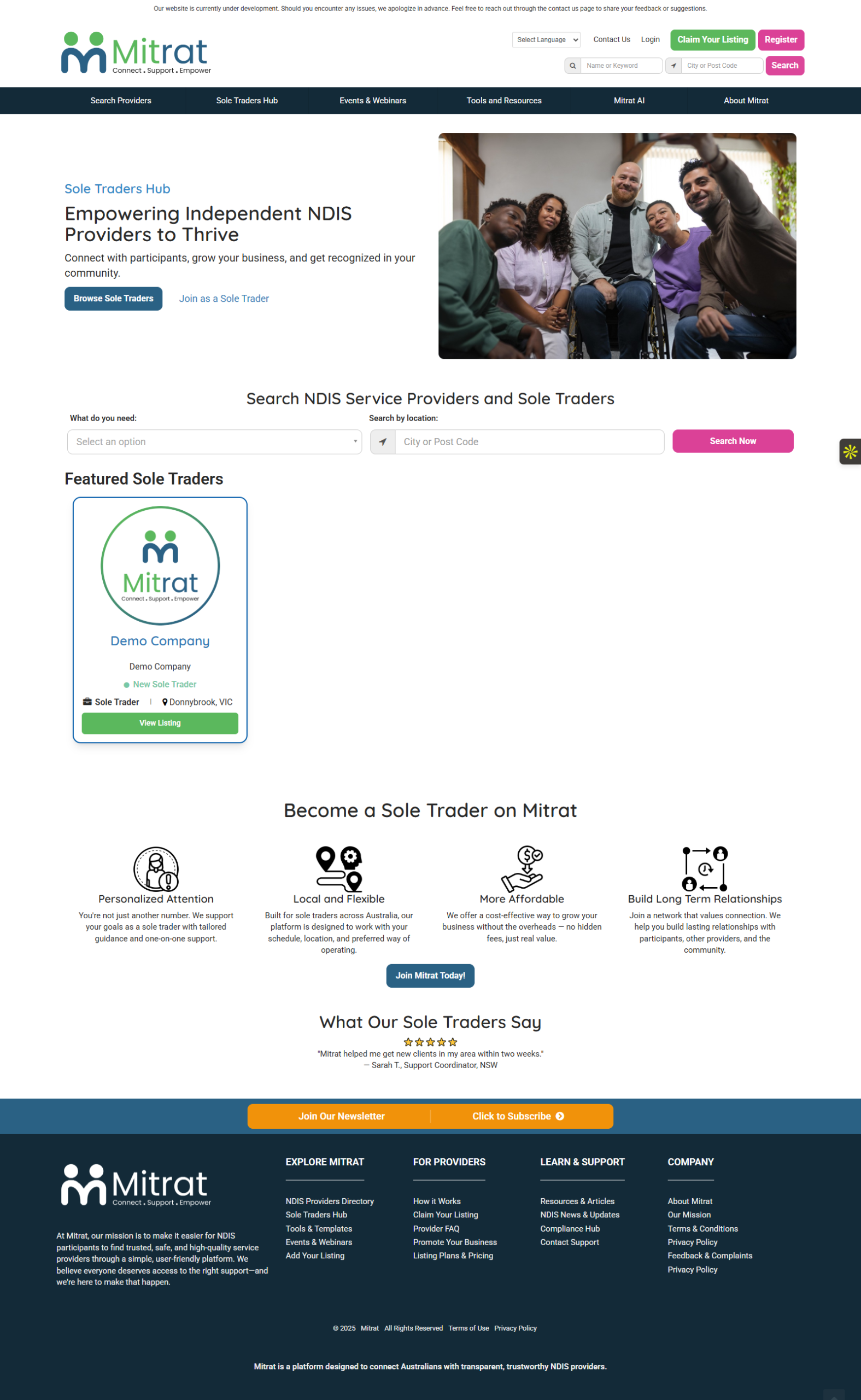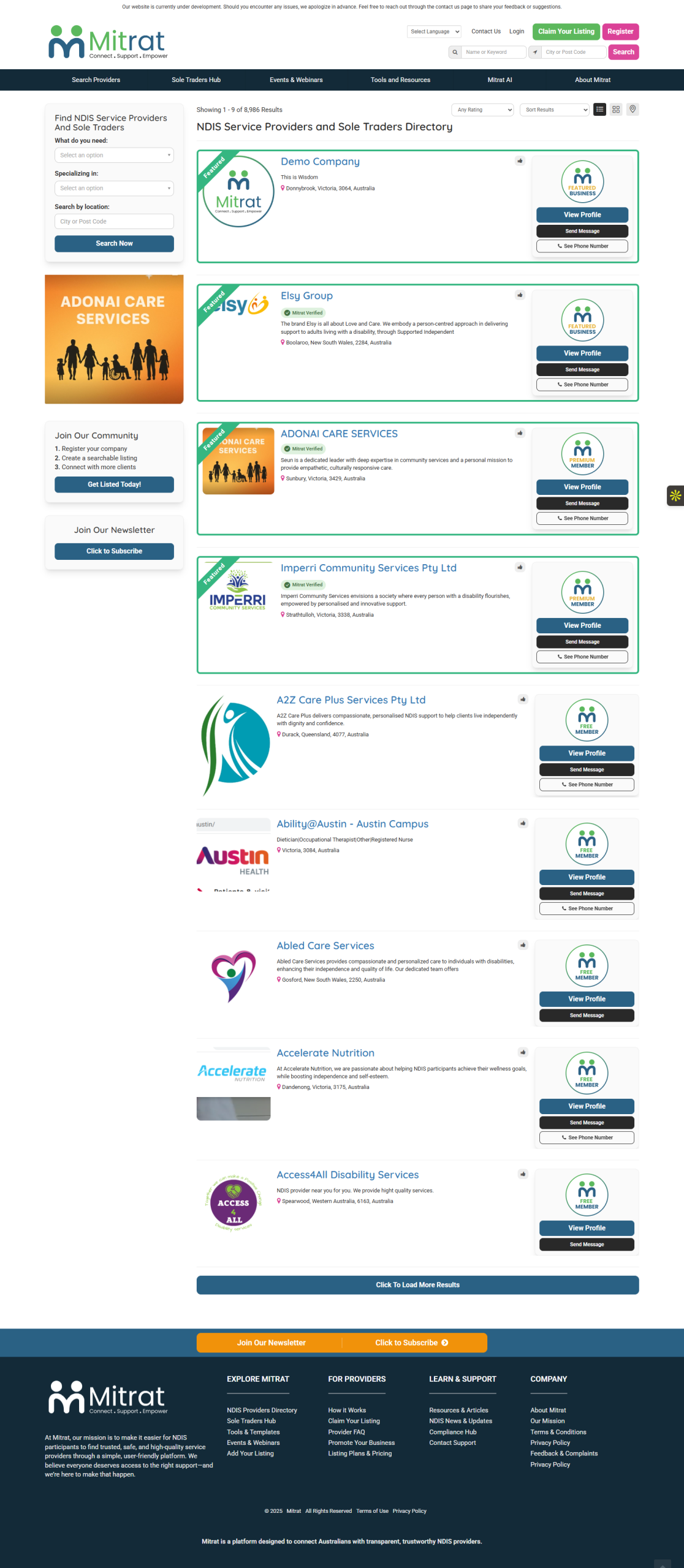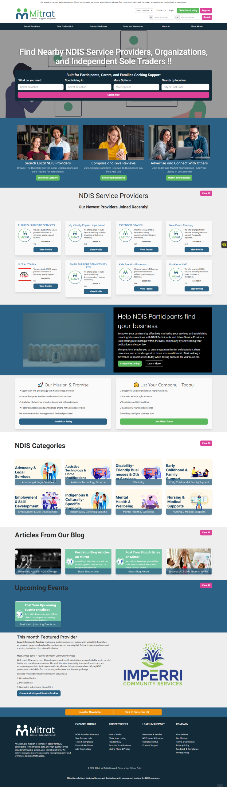Mitrat is a comprehensive NDIS Provider Directory platform built on Brilliant Directories to connect NDIS participants, support coordinators, and service providers across Australia. The platform was architected as more than a directory—it functions as a scalable ecosystem combining verified listings, tiered memberships, lead generation, dashboards, email automation, and future-ready tools such as AI support and digital products.